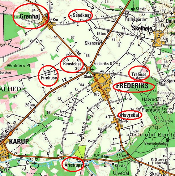 Fra Frederikshøj (Grønhøj) udflyttedes 10 gårde. 4 gårde flyttedes mod syd, og den nye koloni fik navnet "Firehuse". 2 gårde flyttedes mod nord og fik navnet "Tohuse" og 4 gårde mod vest. Her var i forvejen en lokalitet med navnet "Resenfelde" så det blev navnet på den nye koloni. Tilsvarende udflyttedes fra Frederikshede (Havredal) ved samme tid 10 gårde: 5 til Aarestrup, 2 til Ulvedal og 3 mod øst hvor de fik navnet "Trehuse". I 1793 udflyttedes yderligere 5 gårde fra Frederikshøj mod syd og mod øst til lokaliteterne "Benslehøj" og "Sandkærgårde".