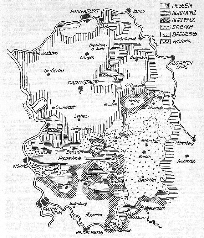 Frankfurt og Heidelberg med angivelse af de forskellige territoriale